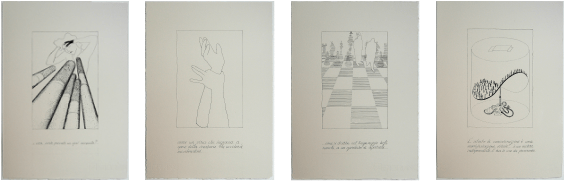 2011 – La ragione imperfetta; ilustrations of the book by Luigi Brandajs. 19 Illustrations of the text in ink, on fabrianno paper 300gr. The originals are numbered and signed at the back, in pencil.